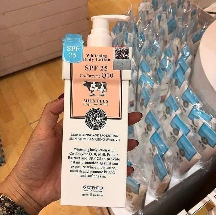 Handbody yang mengandung SPF dan memutihkan kulit selanjutnya adalah Scentio Whitening Body Lotion SPF 25. Produk ini diklaim ampuh dalam menjaga kulit dari paparan sinar ultraviolet berkat kandungan SPF 25 di dalamnya. Diformulasikan dengan vitamin B3 & B5 dan co-enzim Q10, Scentio Whitening Body Lotion SPF 25 efektif dalam memutihkan kulit sekaligus mencegah penuaan dini. Kombinasi dua kandungan ini juga menjaga kulit dari radikal bebas dan kerusakan.